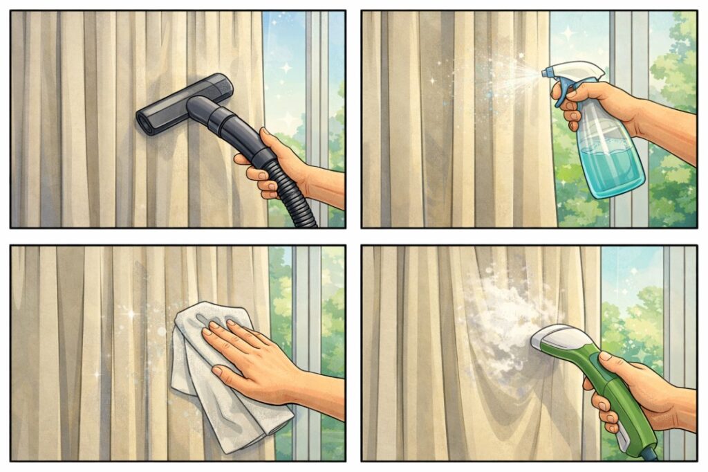 Fortunately, simple methods such as vacuuming, spot cleaning, fabric sprays, and steam cleaning allow you to maintain curtain hygiene without taking them down. These easy techniques help remove dust, refresh the fabric, and keep your home environment healthier.