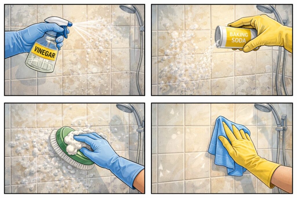 In my own bathroom, soap scum started appearing on the shower tiles after a few months. Instead of using strong cleaners, I tried spraying vinegar and wiping the tiles after every few days. Within a short time, the cloudy layer disappeared and the tiles looked much cleaner.