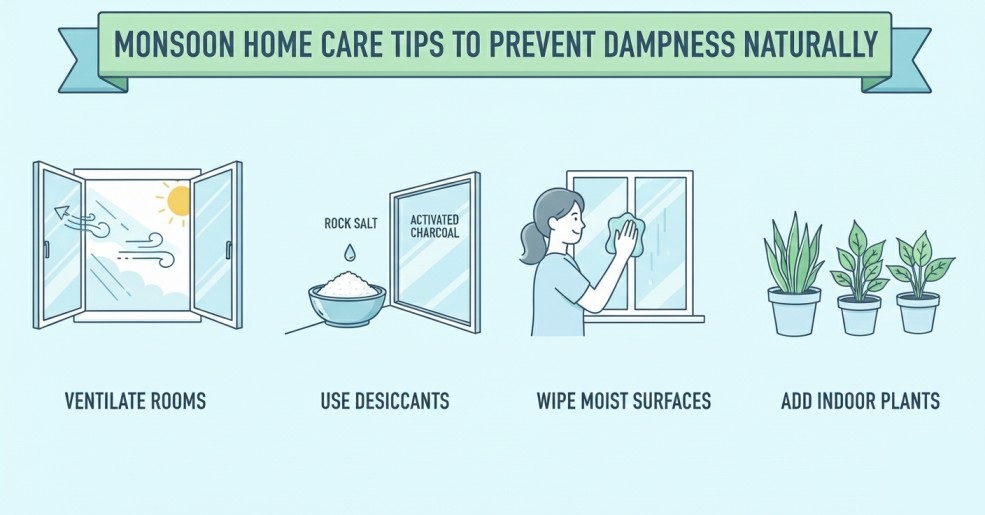 Learn effective monsoon home care tips to prevent dampness, mold, and musty odors using simple, natural methods suitable for everyday homes.